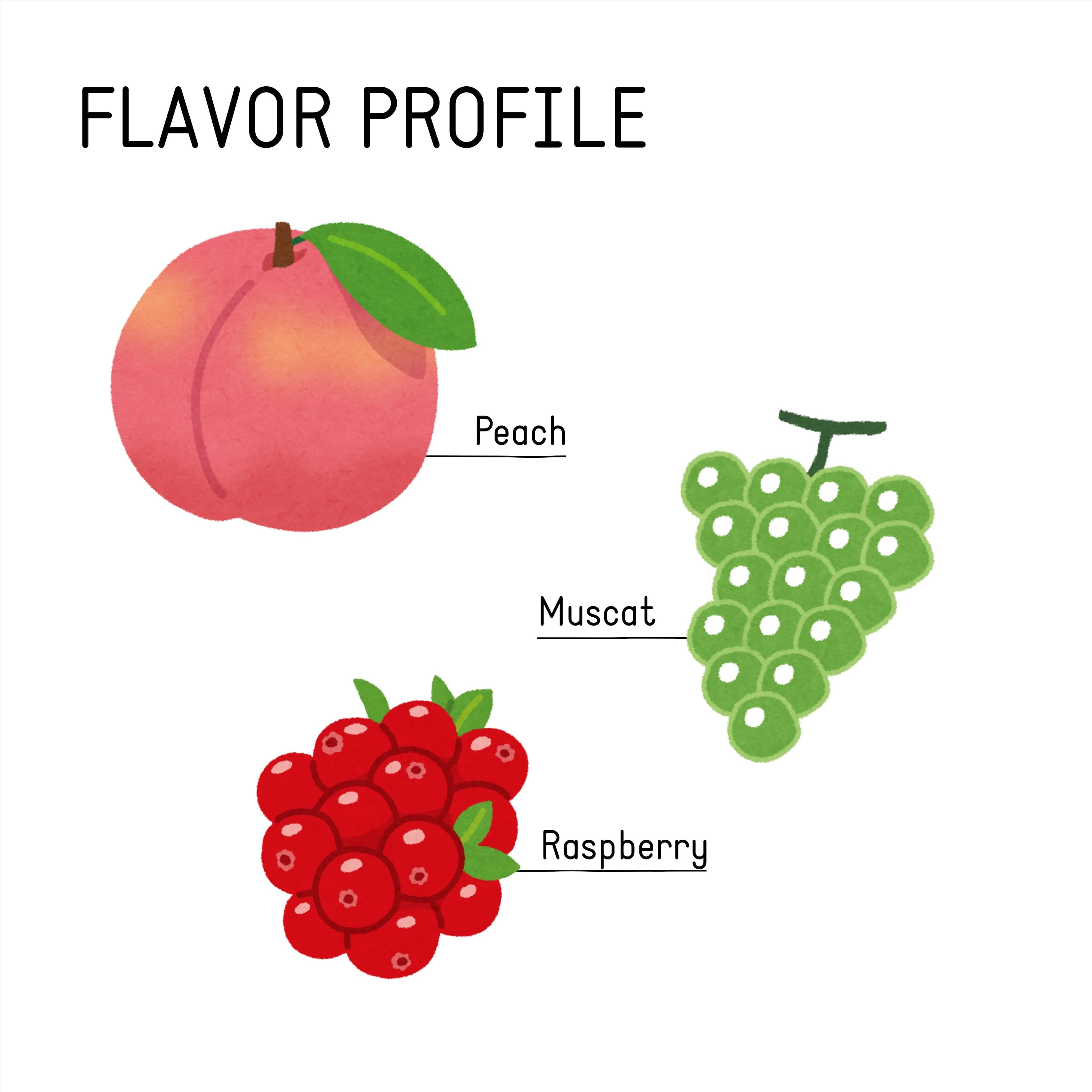 ラズベリーや白桃、マスカットを思わせる、みずみずしい果実感。そこにやさしい甘さが重なります。